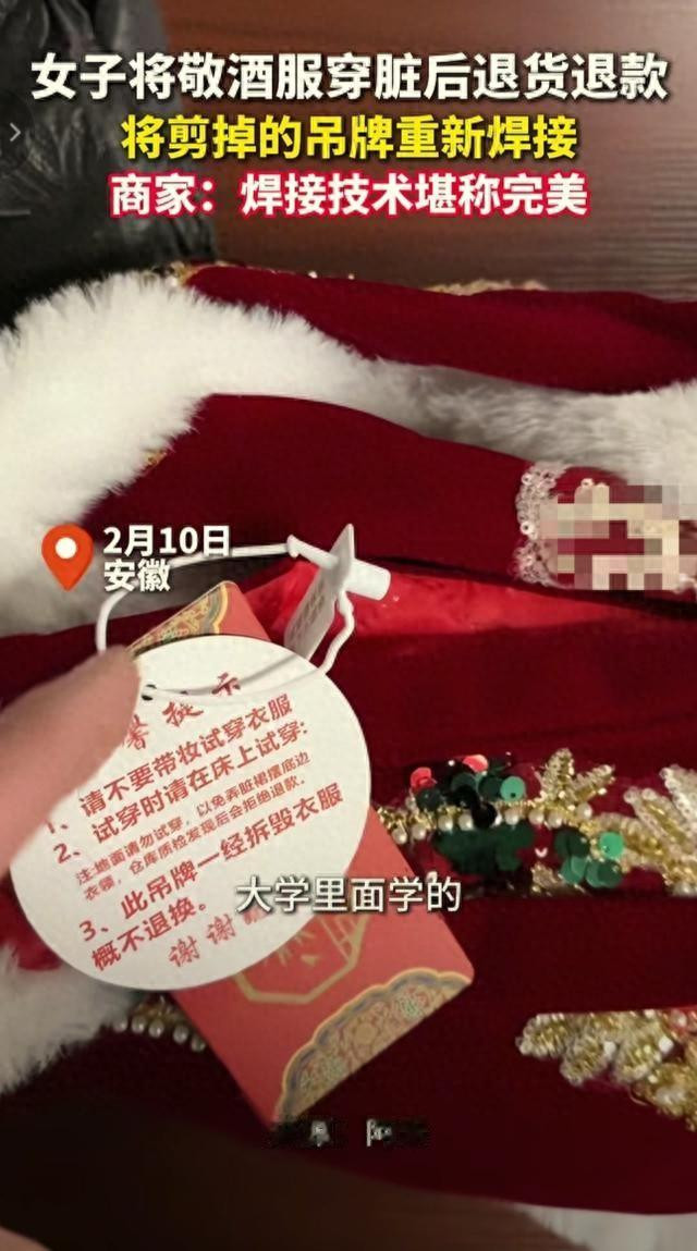 近日,安徽一位商家在网上卖敬酒服,过了几天收到退货,检查时差点气笑——衣服明显被穿过,吊牌却被人剪掉后又“焊”了回去。商家吐槽:“这新娘怕不是学的焊接专业?”更绝的是,商家顺着退货信息扒出,新娘嫁到了山东菏泽巨野县太平镇,地址没具体到村,倒是把男方也拖下了水。