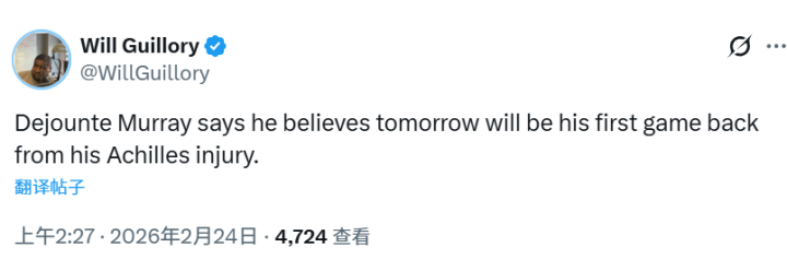 北京时间2月24日,据鹈鹕队记吉洛里报道,德章泰-穆雷表示,他预计将在明日迎来本赛季首秀。鹈鹕明天将主场迎战勇士。